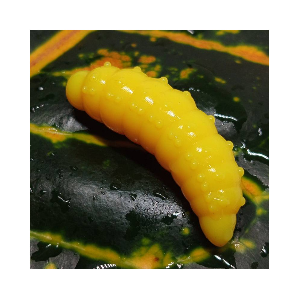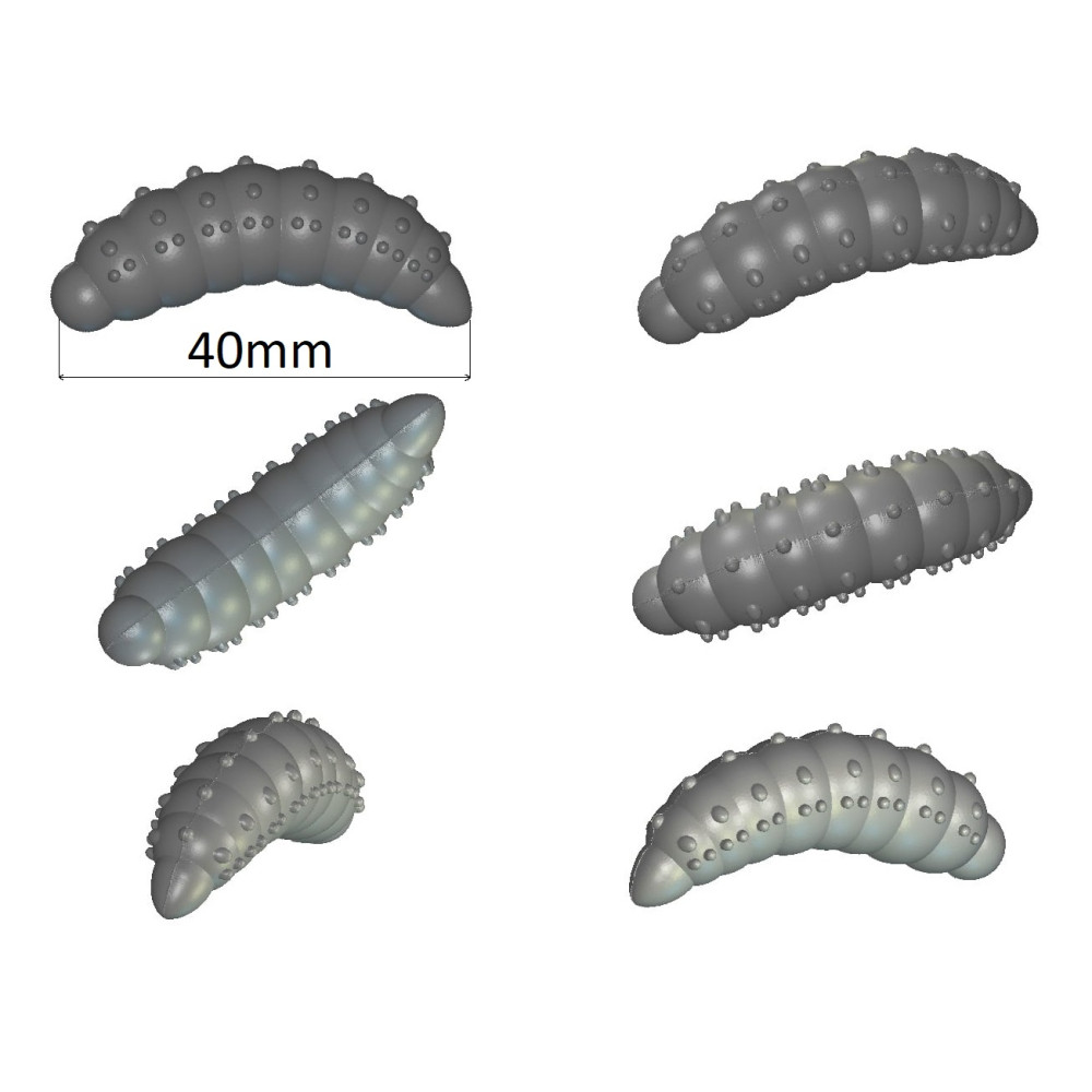 Tato larva měří 36mm a váží 2,1g, a to už se počítá, protože s ním nahodíte opravdu daleko, i když nemáte zrovna speciální prut na lov pstruhů. Je tedy vhodný i pro sváteční lovce duháků či naprosté amatéry. Materiál je super měkký, měkčí než Nympcho!