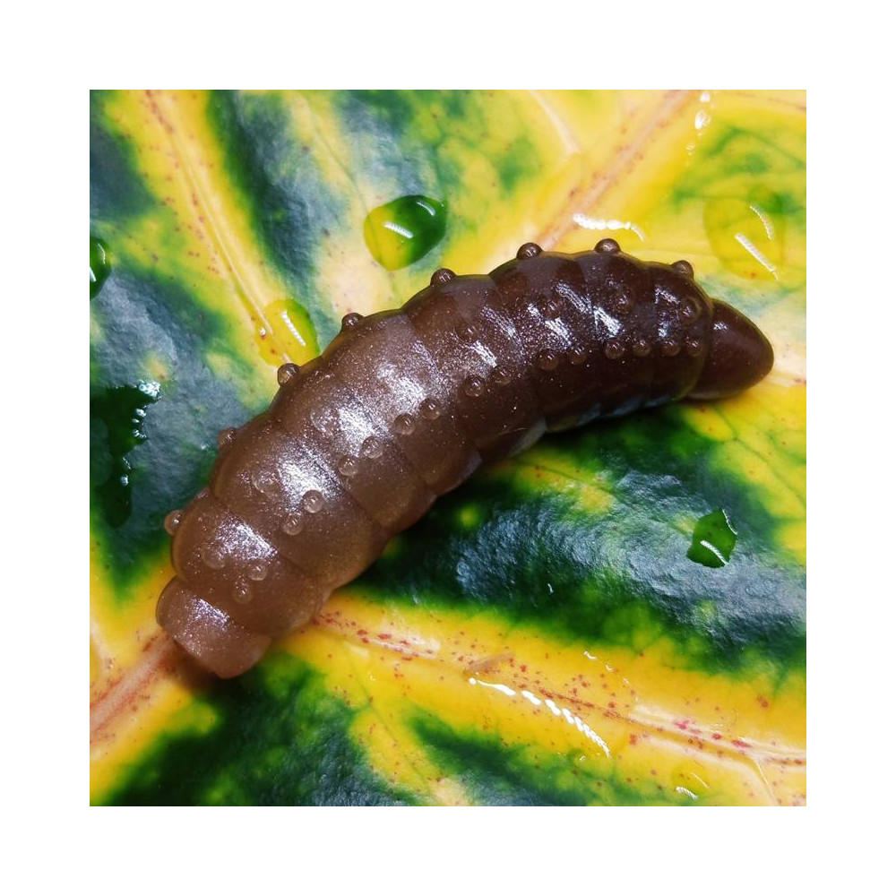 Tato larva měří 36mm a váží 2,1g, a to už se počítá, protože s ním nahodíte opravdu daleko, i když nemáte zrovna speciální prut na lov pstruhů. Je tedy vhodný i pro sváteční lovce duháků či naprosté amatéry. Materiál je super měkký, měkčí než Nympcho!