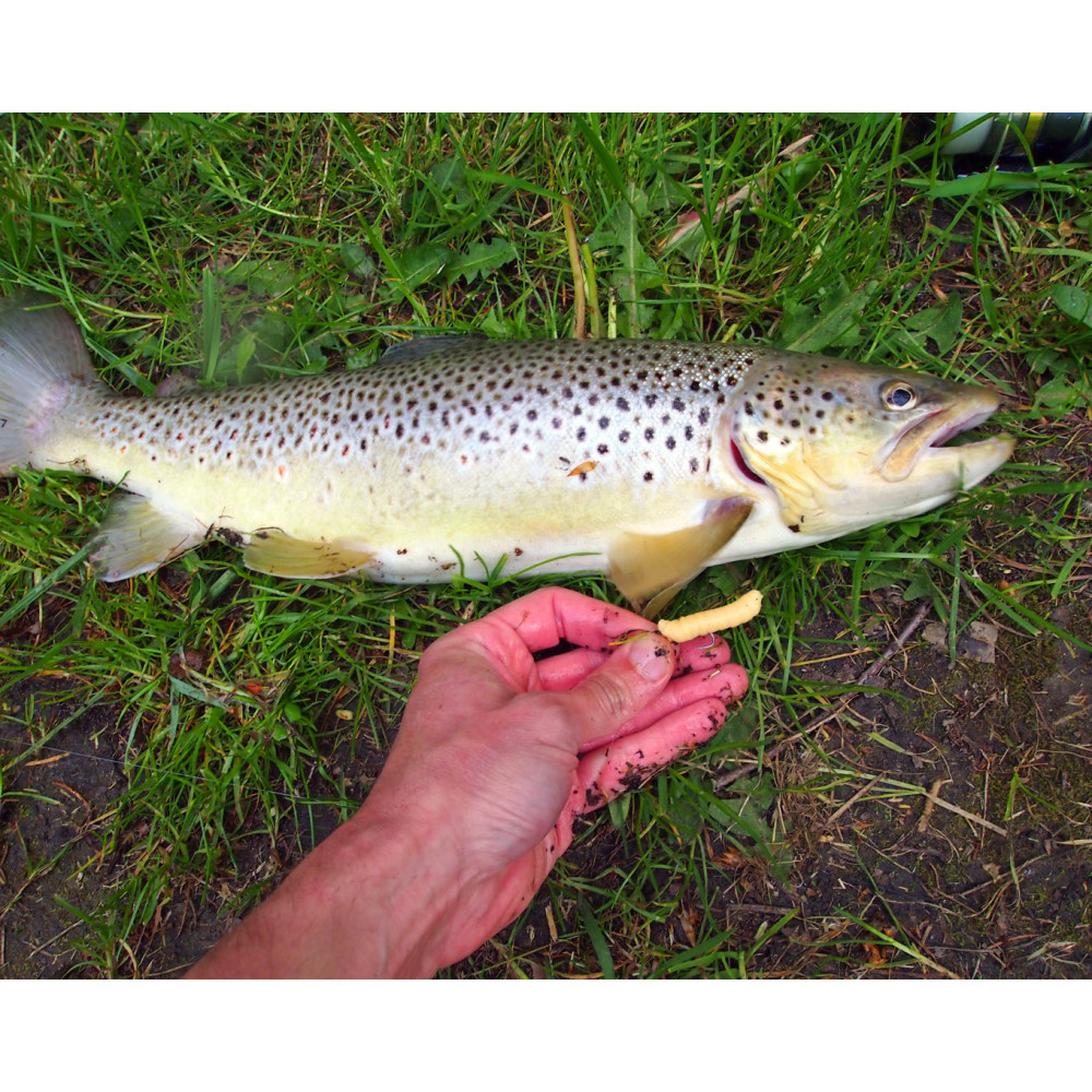 Realistická napodobenina larvy chrostíka určená na UL přívlač na pstruhy, jelce a bílou rybu
