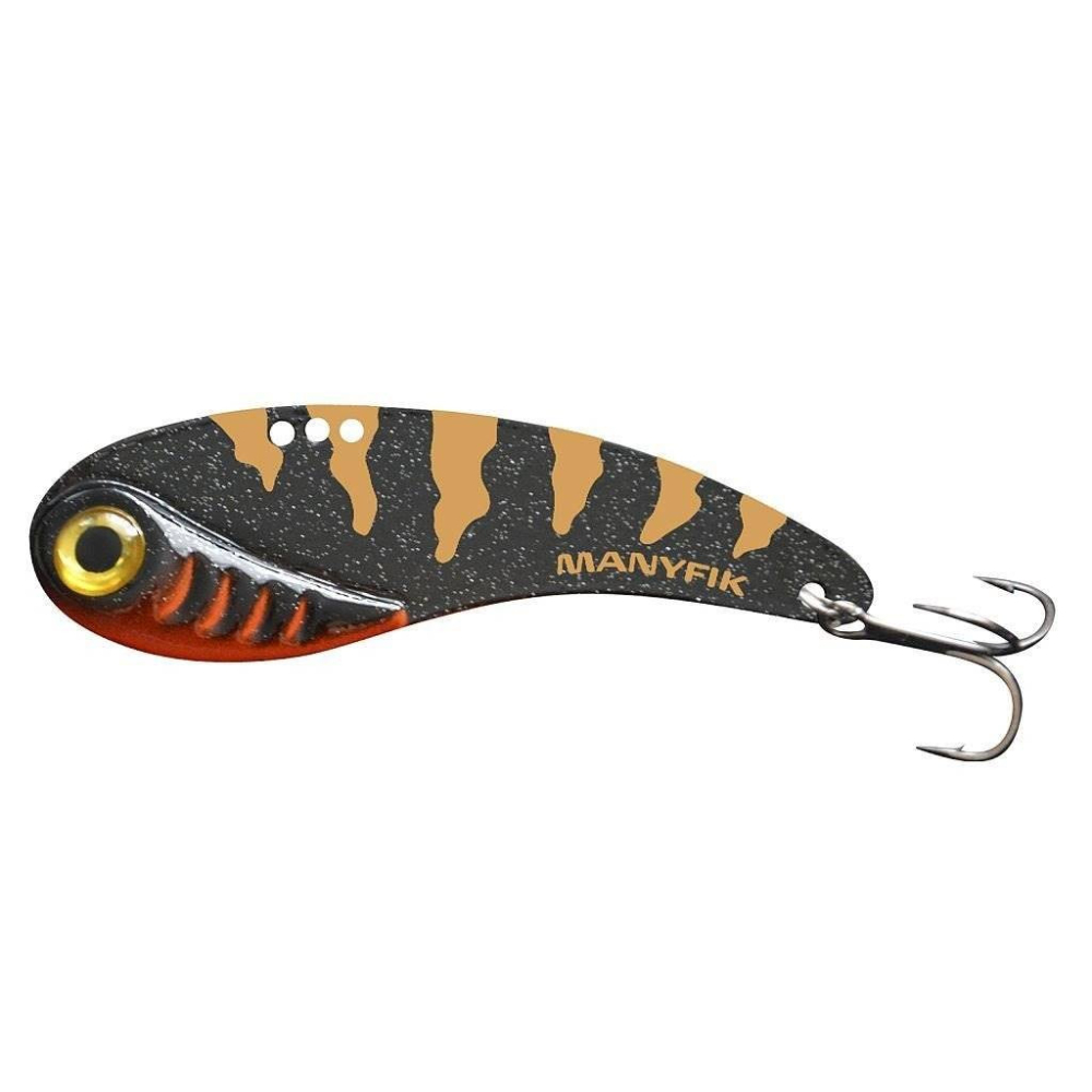 Kovová nástraha s plochým tělem a agresivní prací určená candátům a okounům.