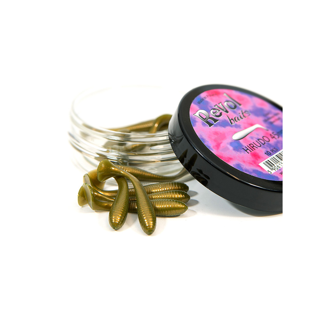 Název Hirudo pochází z latiny a znamená pijavice. V podání Revol Baits je Hirudo miniaturní kopýtko v délce 45mm s kulovitou vroubkovanou hlavou a zploštělou zadní částí těla představující ocasní násadec. Hirudo představuje malé kopýtko určené hlavně na lov okounů. Nástraha se prodává v baleních po 10 kusech a voní po krevetě. Díky kombinaci kulovité hlavy a zploštělého ocasního násadce dává velmi agresivní práci, což při tak malé nástraze dokáže zaujmout i větší ryby.