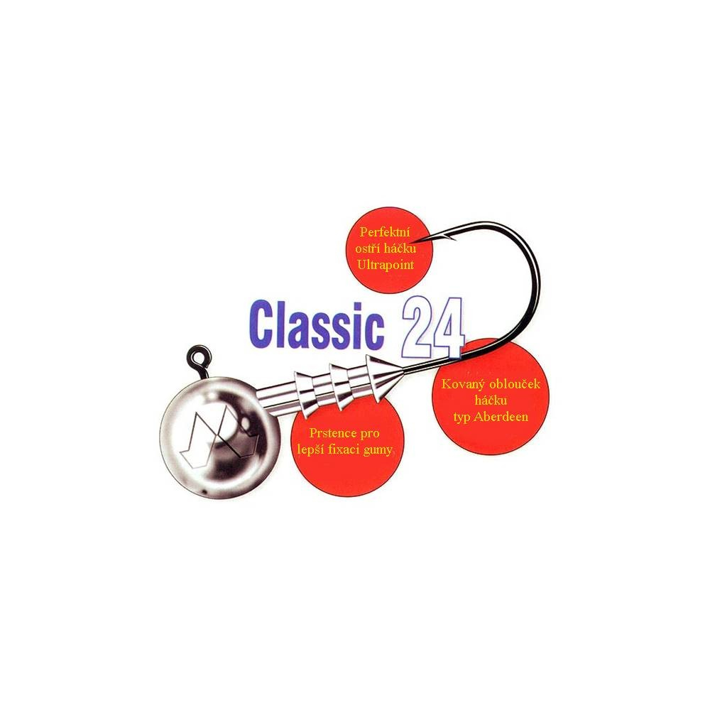 Klasické jigové hlavičky odlité na vysoce kvalitních háčcích Mustad Ultra Point s kruhovým obloučkem háčku a rovným ostřím. Střední část ramínka a oblouček háčku byly zploštěny, aby háček lépe odolával zátěži a ohnutí. Jigové hlavičky mají velmi univerzální použití a hodí se k lovu většiny ryb.