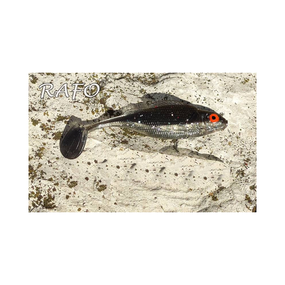 Jeden z mých kolegů z Polska vyrobil zajímavý design ryby, která má v našem jazyce ošklivé jméno: "balavac". Ten design se mi líbil na prvním, protože vím, že ježdíci jsou oblíbenci šmoulů (candátů). Jak to však u realistických modelů bývá, chybí mu funkčnost. Převzal jsem ten model a pár měsíců jsem si zahrával s přepracováním, nakonec se opět objevilo staré rčení, raději udělat nový, než opravit cizí chyby. Tak co to je - tady to je, snaha se vyplatila, po 4 redesignech jsme dostali funkční a extrémně chytlavou nástrahu. RAFO je guma extrémně atraktivních vibrací, výkonný ocas drží i ve slabém proudu a správně přenáší tuto vibraci do celého těla. Prozatím nabízíme ve velikostech 9 a 11 cm, uvidíme jestli bude potřeba větší modely. Cílová ryba? No asi každý predátor, který se živí rybami, protože Rafova akce ve vodě je prostě neodolatelná. Nástraha je vyrobena z netoxického materiálu bez obsahu jedů a je přátelská k životnímu prosředí.