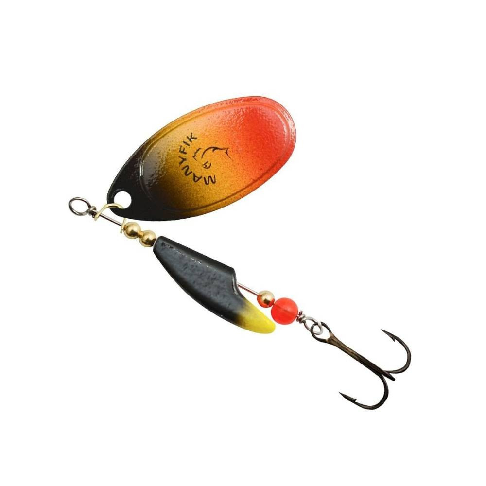 Rotačka Mobby F byla navržena tak, aby vyřešila odvěký problém rotačních třpytek - kroucení vlasce. Manyfik odpovídá - NIKDY VÍCE ! Korpus třpytky byl navržen tak, aby měl excentrický tvar a bránil přenášení rotace listu na vlasec. Klasické křidélko typu AGLIA potěší rybáře lovící okouny a štiky. Kulatý korálek je dodatečným spouštěčem záběrů, který pro okouny i štiky působí jako velmi dráždivé místo, kam směřuje svůj útok na nástrahu. Třpytky Mobby F jsou dostupné s křidélkem z niklu (stříbrné) nebo z mosazi (zlaté a lakované).