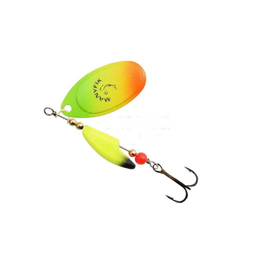 Rotačka Mobby F byla navržena tak, aby vyřešila odvěký problém rotačních třpytek - kroucení vlasce. Manyfik odpovídá - NIKDY VÍCE ! Korpus třpytky byl navržen tak, aby měl excentrický tvar a bránil přenášení rotace listu na vlasec. Klasické křidélko typu AGLIA potěší rybáře lovící okouny a štiky. Kulatý korálek je dodatečným spouštěčem záběrů, který pro okouny i štiky působí jako velmi dráždivé místo, kam směřuje svůj útok na nástrahu. Třpytky Mobby F jsou dostupné s křidélkem z niklu (stříbrné) nebo z mosazi (zlaté a lakované).