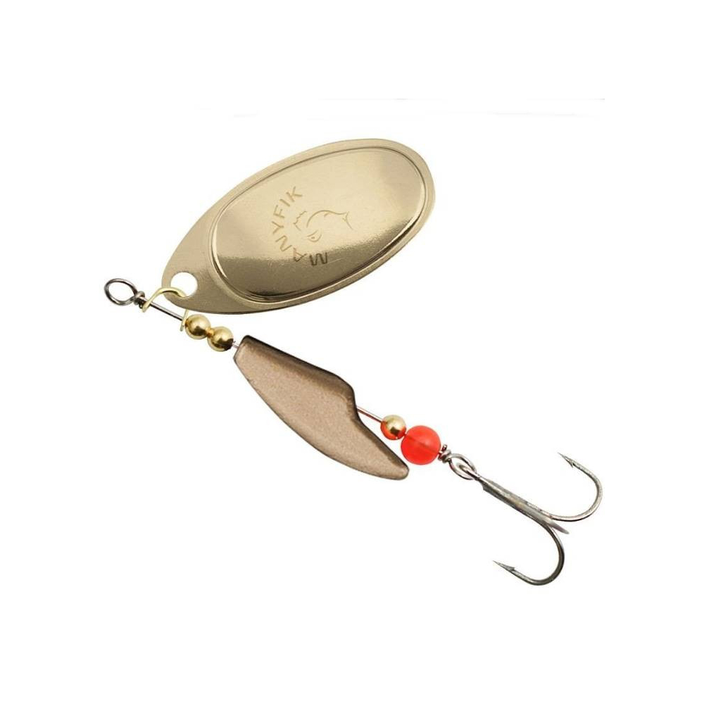 Rotačka Mobby F byla navržena tak, aby vyřešila odvěký problém rotačních třpytek - kroucení vlasce. Manyfik odpovídá - NIKDY VÍCE ! Korpus třpytky byl navržen tak, aby měl excentrický tvar a bránil přenášení rotace listu na vlasec. Klasické křidélko typu AGLIA potěší rybáře lovící okouny a štiky. Kulatý korálek je dodatečným spouštěčem záběrů, který pro okouny i štiky působí jako velmi dráždivé místo, kam směřuje svůj útok na nástrahu. Třpytky Mobby F jsou dostupné s křidélkem z niklu (stříbrné) nebo z mosazi (zlaté a lakované).