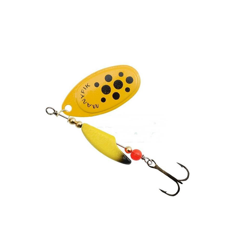 Rotačka Mobby F byla navržena tak, aby vyřešila odvěký problém rotačních třpytek - kroucení vlasce. Manyfik odpovídá - NIKDY VÍCE ! Korpus třpytky byl navržen tak, aby měl excentrický tvar a bránil přenášení rotace listu na vlasec. Klasické křidélko typu AGLIA potěší rybáře lovící okouny a štiky. Kulatý korálek je dodatečným spouštěčem záběrů, který pro okouny i štiky působí jako velmi dráždivé místo, kam směřuje svůj útok na nástrahu. Třpytky Mobby F jsou dostupné s křidélkem z niklu (stříbrné) nebo z mosazi (zlaté a lakované).