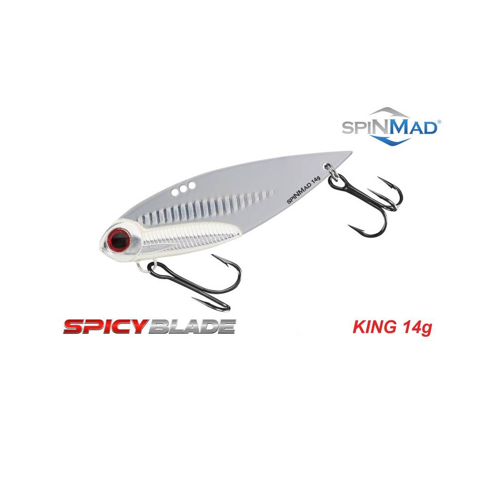 Spicy Blade King 14g je účinná během jigování. Vyznačuje se ideálním vyvážením ve vodě, dráždivou, agresivní prací a silným reflexním světelným efektem. Výhoda 14g cikády King je možnost regulace její práce pomocí tří dírek na zavěšení ve hřbetní části nástrahy. Díky výrazné vibraci, silnému hydroakustickému vlnění a atraktivní barevné nabídce je King jedna z nejlepších nástrah na velké okouny, candáty, štiky a sumce.
